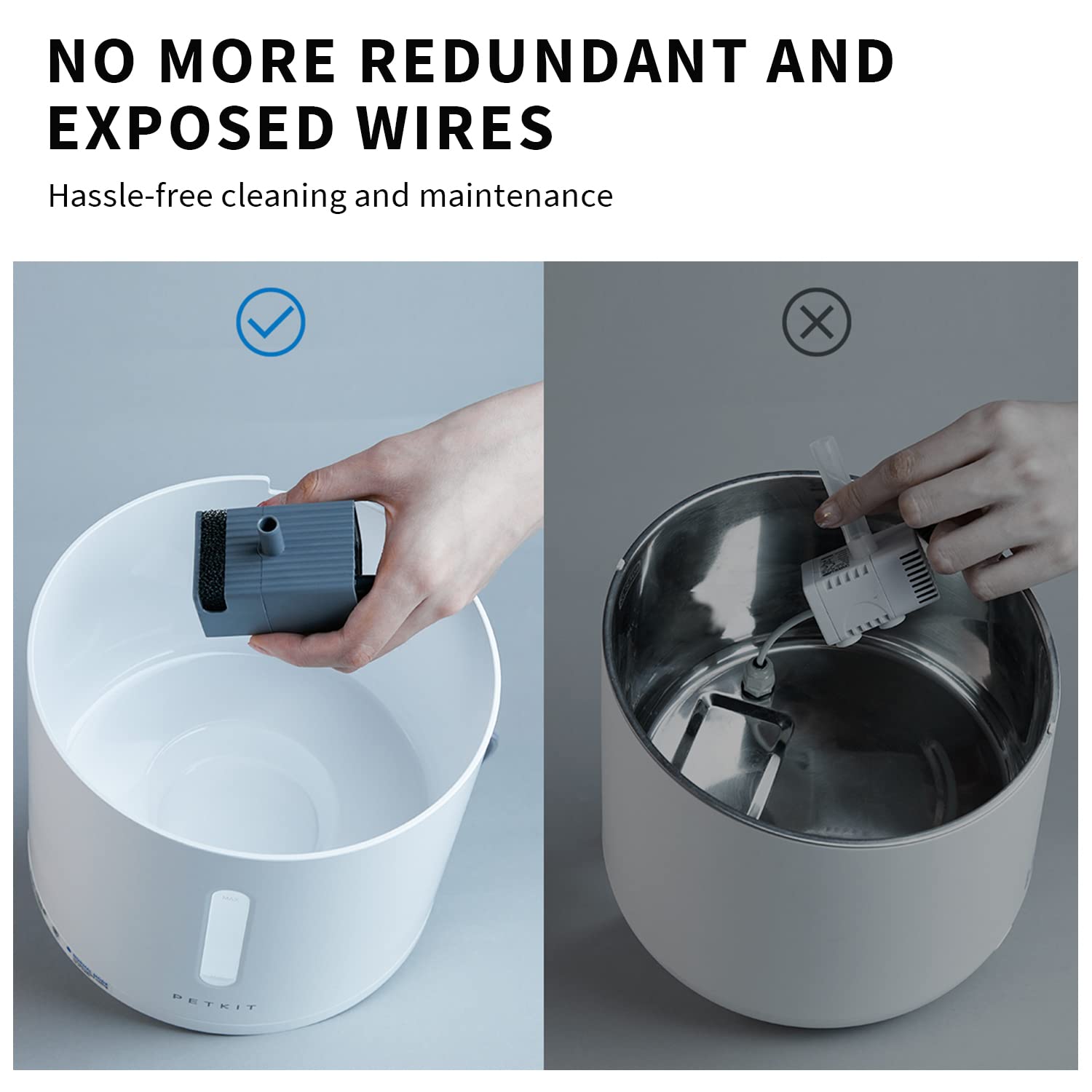 - [Detachable Design] With the detachable water fountain body and base, You won't get the powered base wet when topping up water or cleaning up the fountain.