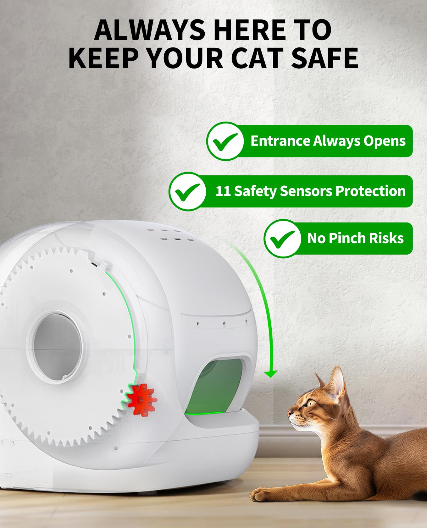 - 100% Safe for Your Cats: The PuraMax 2 cat litter box is equipped with 7 infrared sensors and 4 weight sensors that accurately detect the activity of cats inside or approaching the cat litter box. When the cat approaches the detacting area, the cat litter box pauses to ensure the cat's safety. In addition, the anti-pinch structure keeps the entrance open all the time to prevent your cat from getting stuck.